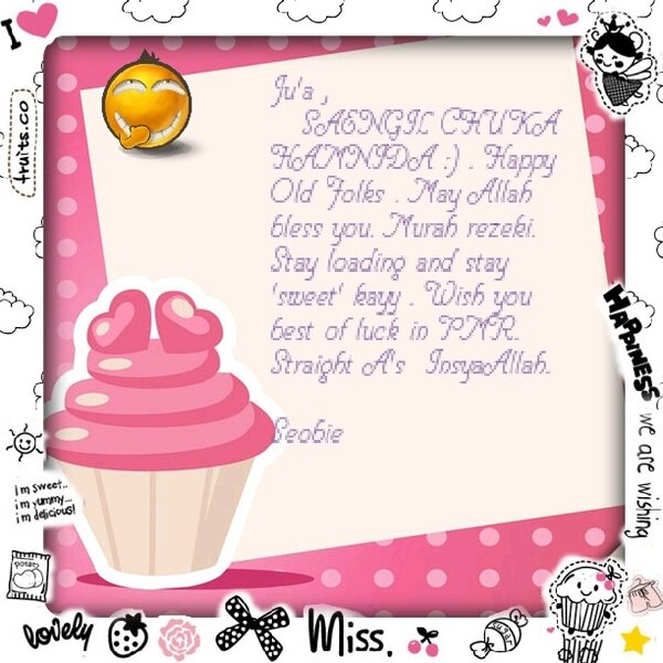 ehem2 , i'm old already . ye eh ? haha , hmm lamaaaaaaa tak update this blog . dah macam macam sarang ada dekat sini . take time ohh nak bersihkan . lastly dapat jugak post something and its about my BORN day ! happyyyy . mereka semua sangat awesomeee :D . this year my birthday sambut dekat rumah . hv a lot of fun act . thank youuuuuuuuuuuu :* pada mereka yg wish sayaa cepat , tepat pada masa or lambat . me appriciate ahh lotttt kay guys . a big thank youuu to my family , my awesomersssssssss 311-T1 , Zora's family , my old primary friend , my twin Fauziah , Nik , Sunny , Jiran katil Shafila , the Unknown Arly , my KD nuyun , Aina , Nurin , Farin , Syazwana , Dalila , Rara , Haniss , Abba , Raja , CBNers Wani-Alia-Sayma , Divyah , my juniors Iffah-Lului-Adzalea , Kak Yatt , Kak Eidy , Kak Nufa , Kak Naddy and yg lain . sorry siapa yg nama dia tak da . sebab penat la nak menulis panjang2 kan . seriously terharu even wish je tapi still sangat2 appriciate . tak sangka mereka semua akan wish . but still , sampai sekarang DIA tak wish lagi . haha .its okay . think positif . bak kata Nad , maybe dia busy and so on . so , biar kan je la kan . dah2 , jangan emo2 kat sini . special day kan . japp ehh ...